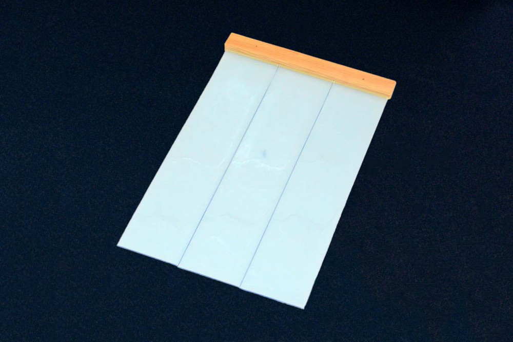 100 × 1,5 mm – es PVC szalagból készül, melyek natúr fenyőlécre vannak szerelve (két léc közé vannak befogatva az egymás mellé helyezett PVC szalagok). A fenyőléc a kutyaházra való felszereléshez elő van fúrva, a csomagban a kutyaajtó mellett megtalálható a felfogatáshoz szükséges csavarok is.
