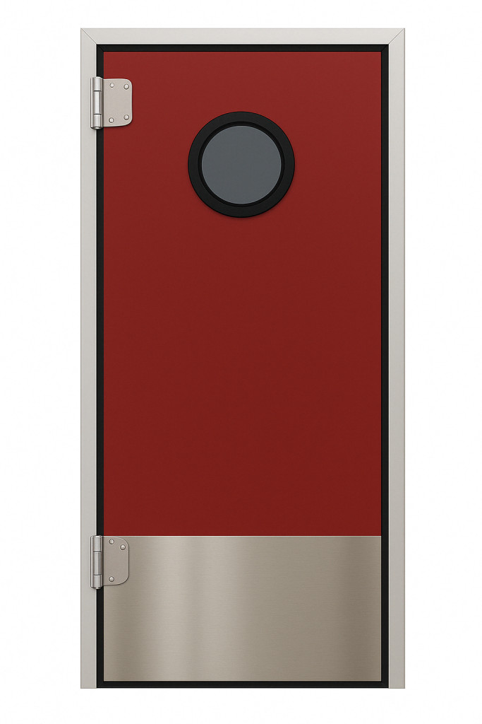 Az alap felszereltség mellett, lehetőség van az ajtólap rugdosó lemezzel való bővítésére, mely megóvja az ajtót az áthaladáskor bekövetkezhető sérülésektől, így akár lábbal vagy tároló kocsik áttolásával is lehetséges a nyítás. Rugdosólemezeink szálcsiszolt rozsdamentes lemezből készülnek.