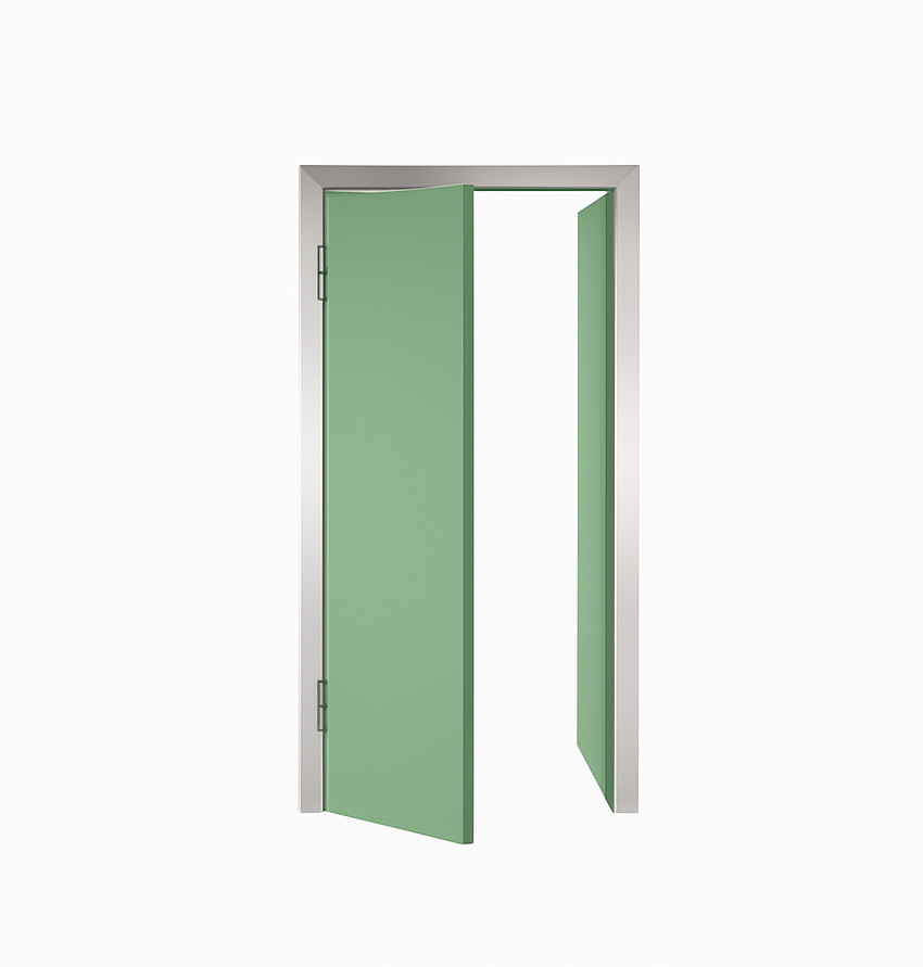 Az ajtólap két oldalt fehér színű stadurlapból áll, szélein alumínium keretprofillal, mely lehetővé teszi az oldalsó gumitömítés elhelyezését a megfelelő záródás érdekében. A zsanérok lehetővé teszik az ajtó mindkét irányból történő nyitását, és 90º -ban történő kitámasztását, ezzel könnyítve az átjárhatóságot. A műanyag borítású acél rugós zsanérok alkalmasak élelmiszeripari használatra is. Az ajtó az áthaladás után visszazáródik mindenféle kézmozdulat nélkül.