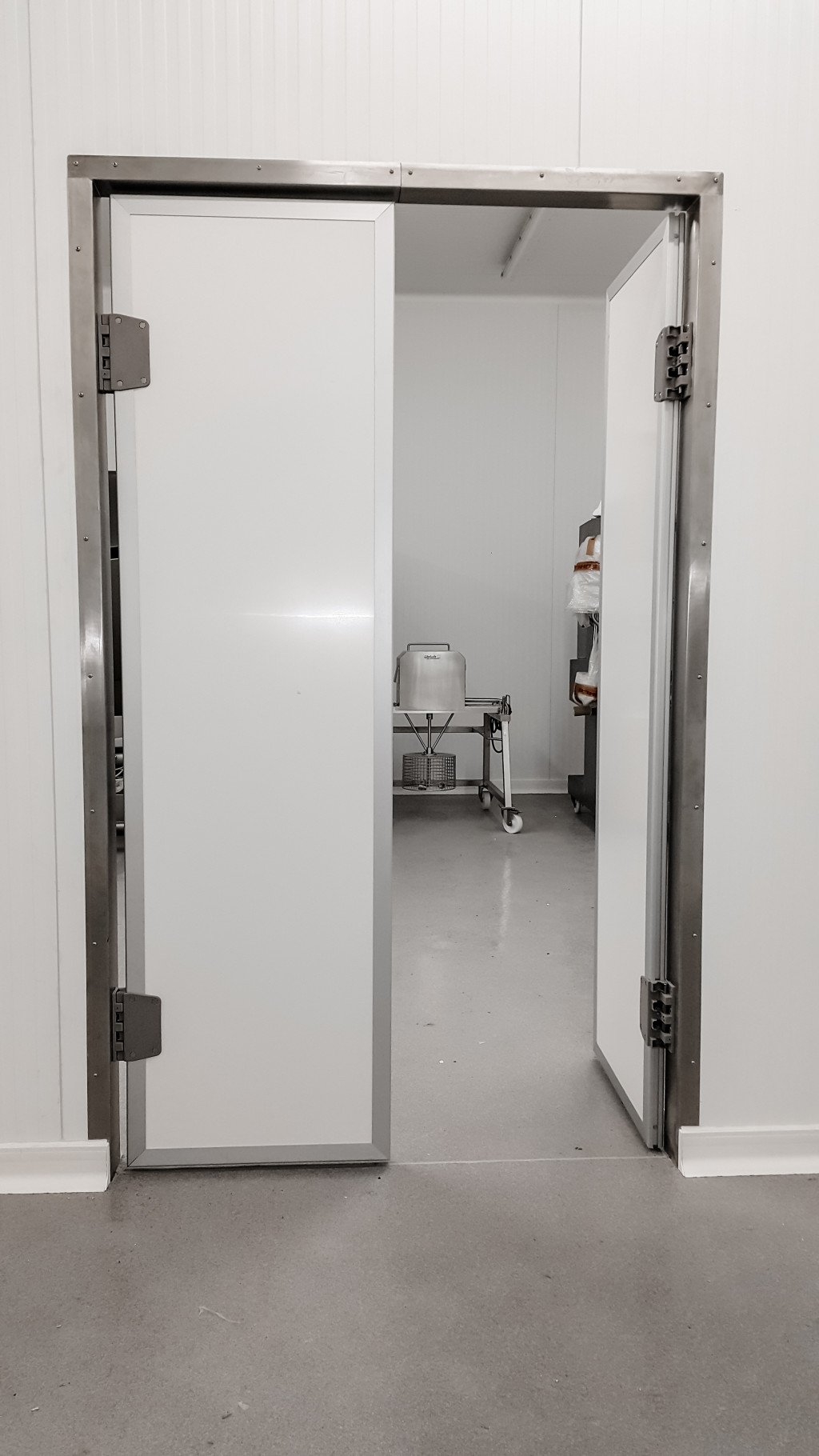 Az ajtólap két oldalt fehér színű stadurlapból áll, szélein alumínium keretprofillal, mely lehetővé teszi az oldalsó gumitömítés elhelyezését a megfelelő záródás érdekében. A zsanérok lehetővé teszik az ajtó mindkét irányból történő nyitását, és 90º -ban történő kitámasztását, ezzel könnyítve az átjárhatóságot. A műanyag borítású acél rugós zsanérok alkalmasak élelmiszeripari használatra is. Az ajtó az áthaladás után visszazáródik mindenféle kézmozdulat nélkül.