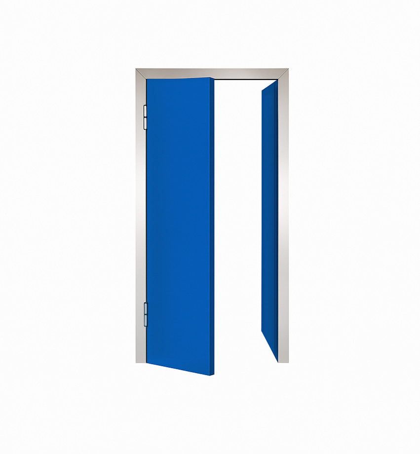 Az ajtólap két oldalt fehér színű stadurlapból áll, szélein alumínium keretprofillal, mely lehetővé teszi az oldalsó gumitömítés elhelyezését a megfelelő záródás érdekében. A zsanérok lehetővé teszik az ajtó mindkét irányból történő nyitását, és 90º -ban történő kitámasztását, ezzel könnyítve az átjárhatóságot. A műanyag borítású acél rugós zsanérok alkalmasak élelmiszeripari használatra is. Az ajtó az áthaladás után visszazáródik mindenféle kézmozdulat nélkül.