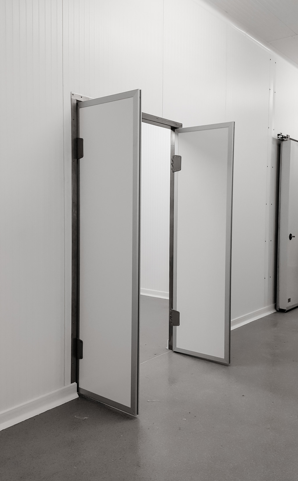 Az ajtólap két oldalt fehér színű stadurlapból áll, szélein alumínium keretprofillal, mely lehetővé teszi az oldalsó gumitömítés elhelyezését a megfelelő záródás érdekében. A zsanérok lehetővé teszik az ajtó mindkét irányból történő nyitását, és 90º -ban történő kitámasztását, ezzel könnyítve az átjárhatóságot. A műanyag borítású acél rugós zsanérok alkalmasak élelmiszeripari használatra is. Az ajtó az áthaladás után visszazáródik mindenféle kézmozdulat nélkül.
