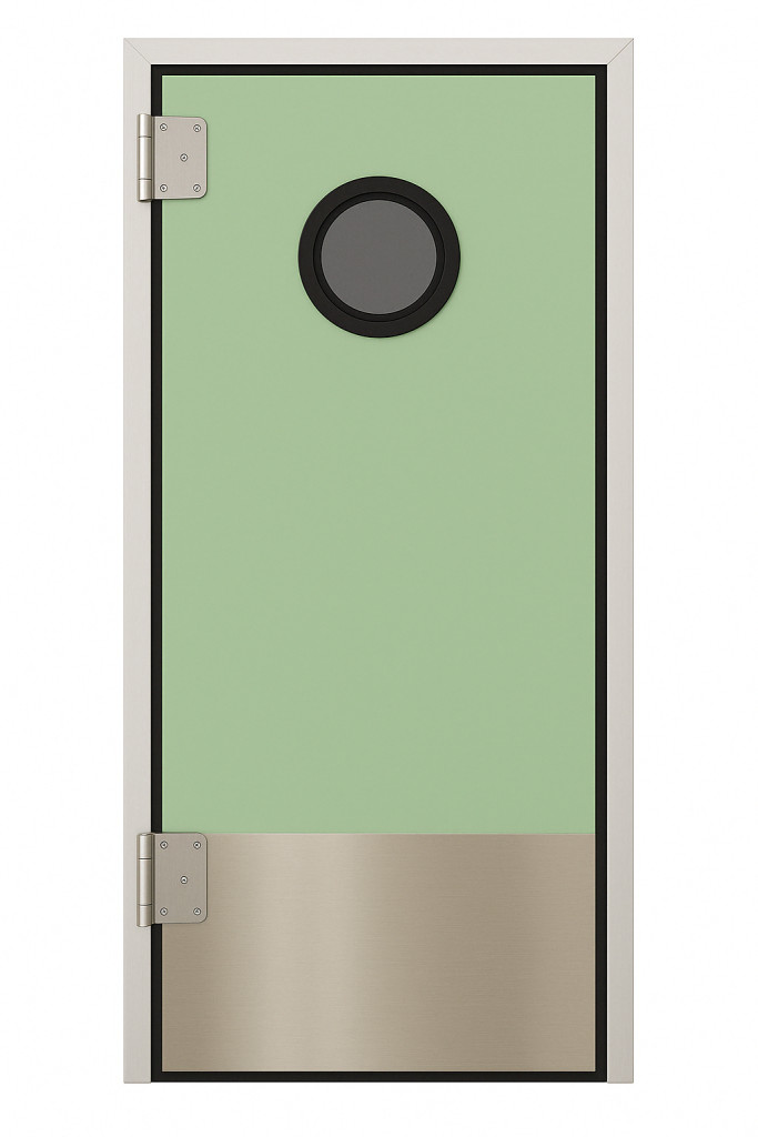 Az ajtólap két oldalt stadurlapból áll, szélein alumínium keretprofillal, mely lehetővé teszi az oldalsó gumitömítés elhelyezését a megfelelő záródás érdekében. A zsanérok lehetővé teszik az ajtó mindkét irányból történő nyitását, és 90º -ban történő kitámasztását, ezzel könnyítve az átjárhatóságot. A műanyag borítású acél rugós zsanérok alkalmasak élelmiszeripari használatra is. Az ajtó az áthaladás után visszazáródik mindenféle kézmozdulat nélkül.