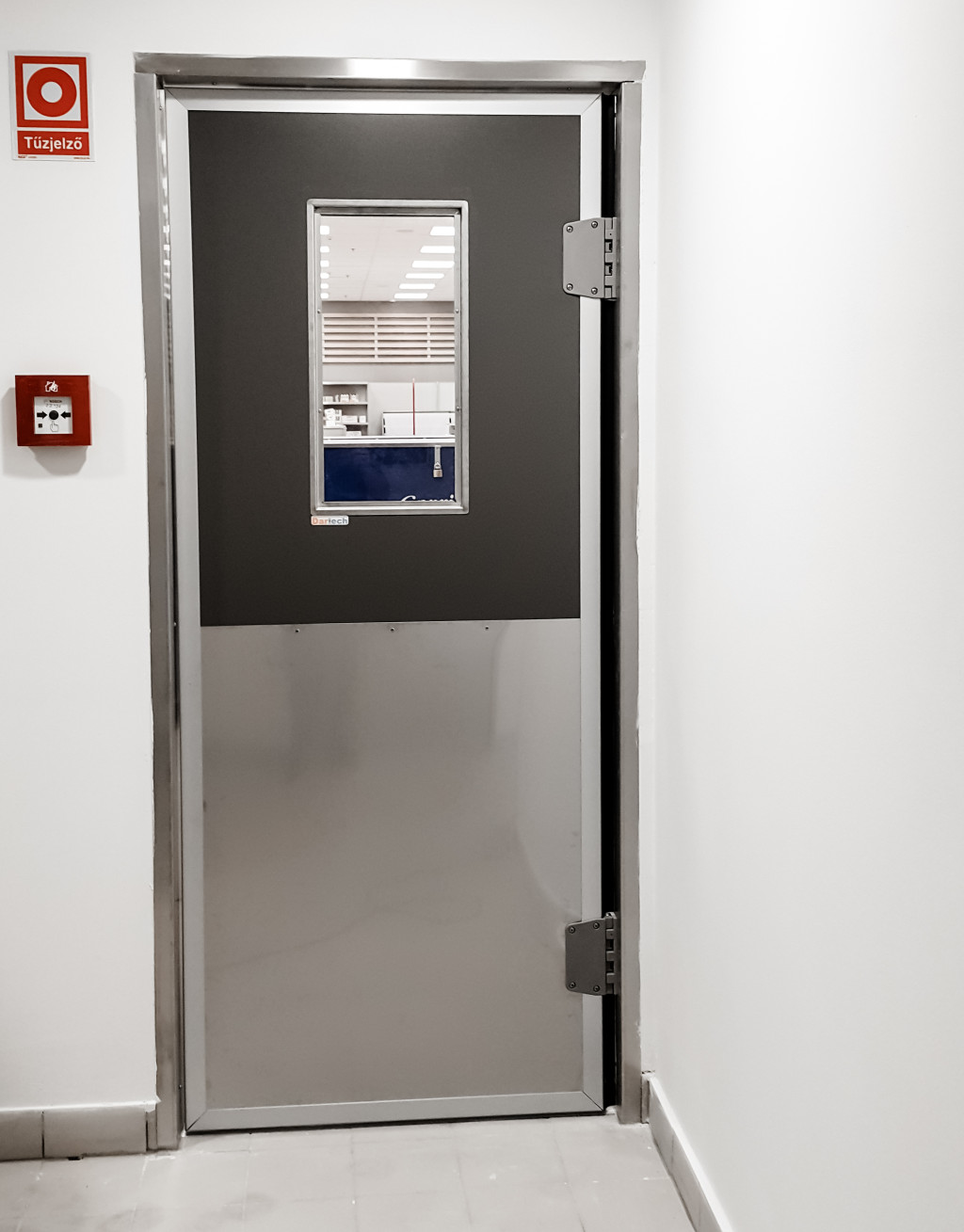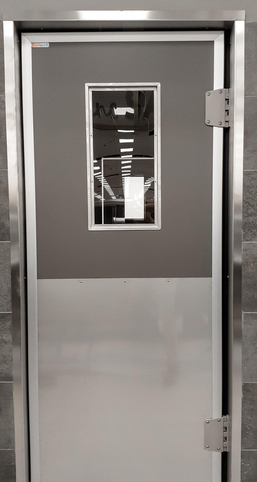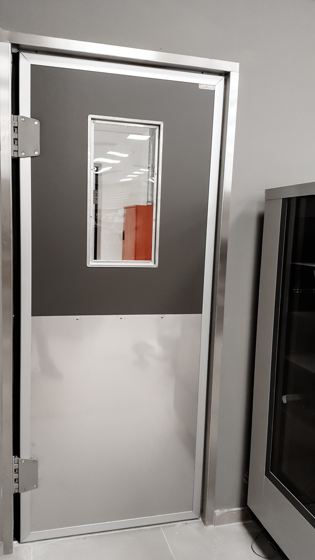 Az ajtólap két oldalt szürke színű stadurlapból áll, szélein alumínium keretprofillal, mely lehetővé teszi az oldalsó gumitömítés elhelyezését a megfelelő záródás érdekében. A zsanérok lehetővé teszik az ajtó mindkét irányból történő nyitását, és 90º -ban történő kitámasztását, ezzel könnyítve az átjárhatóságot. A műanyag borítású acél rugós zsanérok alkalmasak élelmiszeripari használatra is. Az ajtó az áthaladás után visszazáródik mindenféle kézmozdulat nélkül.