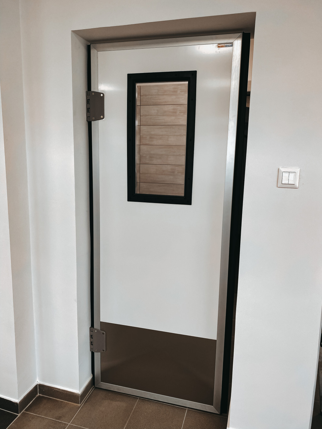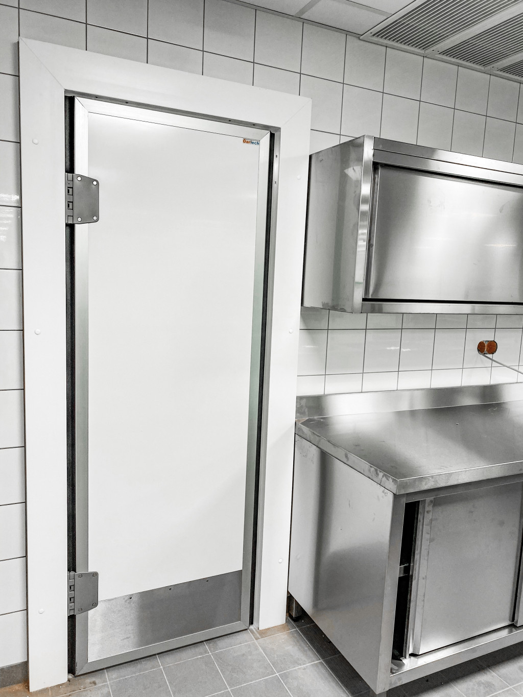 Az ajtólap két oldalt fehér színű stadurlapból áll, szélein alumínium keretprofillal, mely lehetővé teszi az oldalsó gumitömítés elhelyezését a megfelelő záródás érdekében. A zsanérok lehetővé teszik az ajtó mindkét irányból történő nyitását, és 90º -ban történő kitámasztását, ezzel könnyítve az átjárhatóságot. A műanyag borítású acél rugós zsanérok alkalmasak élelmiszeripari használatra is. Az ajtó az áthaladás után visszazáródik mindenféle kézmozdulat nélkül.