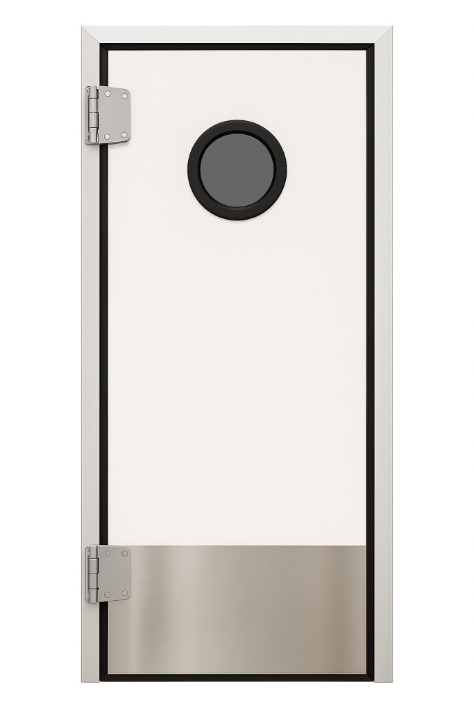 Az ajtólap két oldalt szürke színű stadurlapból áll, szélein alumínium keretprofillal, mely lehetővé teszi az oldalsó gumitömítés elhelyezését a megfelelő záródás érdekében. A zsanérok lehetővé teszik az ajtó mindkét irányból történő nyitását, és 90º -ban történő kitámasztását, ezzel könnyítve az átjárhatóságot. A műanyag borítású acél rugós zsanérok alkalmasak élelmiszeripari használatra is. Az ajtó az áthaladás után visszazáródik mindenféle kézmozdulat nélkül.
